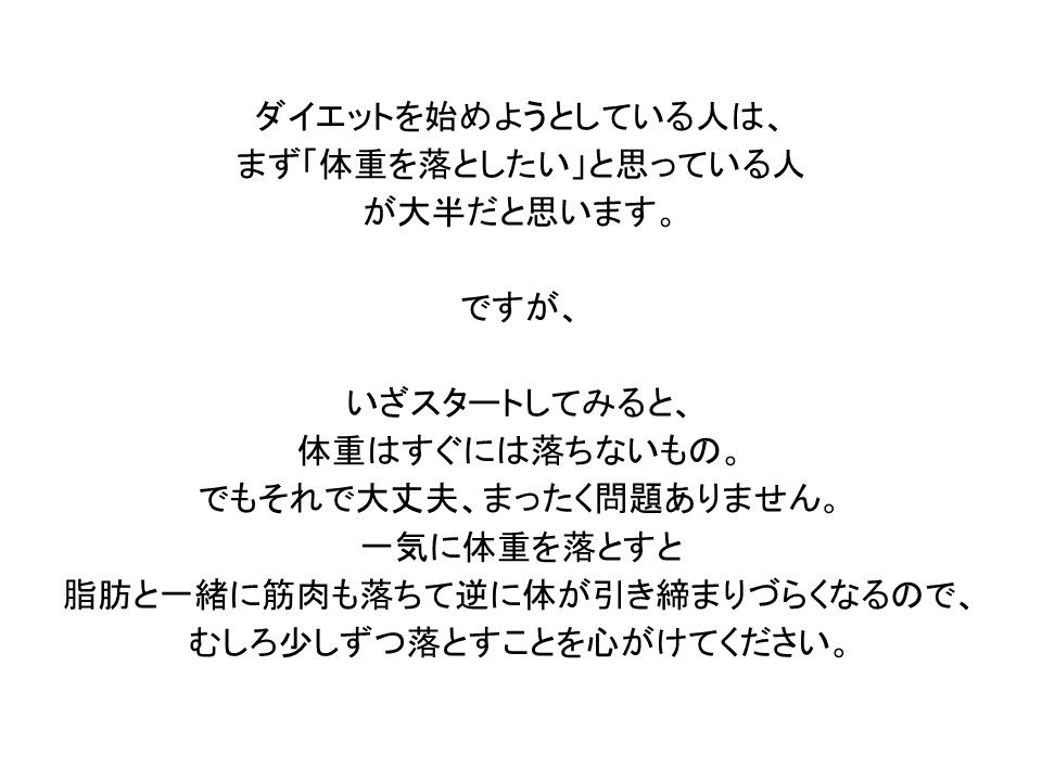 ダイエットを始めようとしている人は、まず「体重を落としたい」と思っている人が大半だと思います。ですが、いざスタートしてみると、体重はすぐには落ちないもの。でもそれで大丈夫、まったく問題ありません。一気に体重を落とすと脂肪と一緒に筋肉も落ちて逆に体が引き締まりづらくなるので、むしろ少しずつ落とすことを心がけてください。