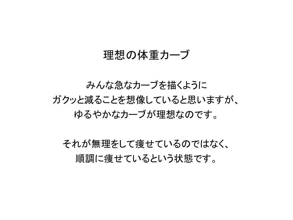 みんな急なカーブを描くようにガクッと減ることを想像していると思いますが、ゆるやかなカーブが理想なのです。それが無理をして痩せているのではなく、順調に痩せているという状態です。