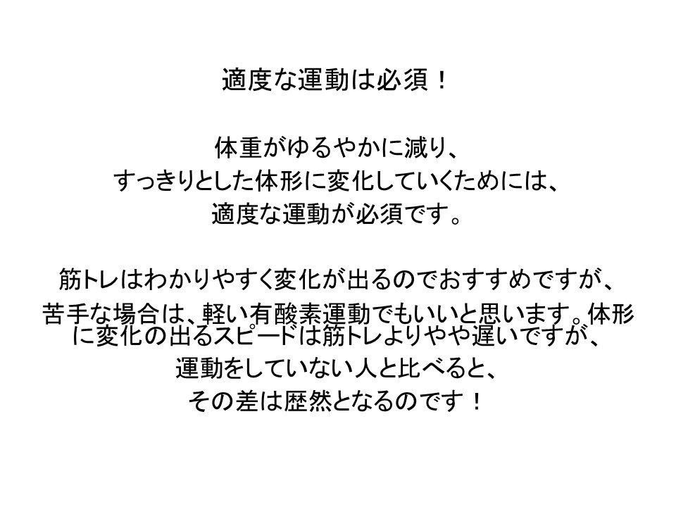 体重がゆるやかに減り、すっきりとした体形に変化していくためには、適度な運動が必須です。筋トレはわかりやすく変化が出るのでおすすめですが、苦手な場合は、軽い有酸素運動でもいいと思います。体形に変化の出るスピードは筋トレよりやや遅いですが、運動をしていない人と比べると、その差は歴然となるのです!