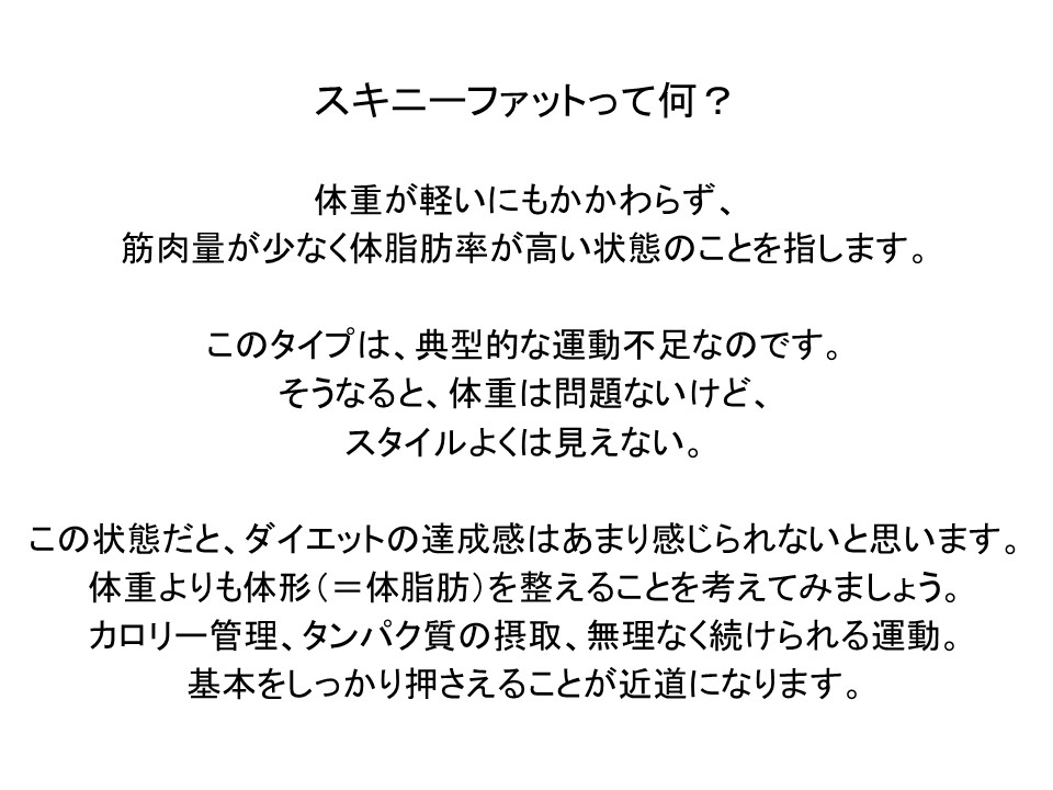 このタイプは、典型的な運動不足なのです。そうなると、体重は問題ないけど、スタイルよくは見えない。この状態だと、ダイエットの達成感はあまり感じられないと思います。体重よりも体形(=体脂肪)を整えることを考えてみましょう。カロリー管理、タンパク質の摂取、無理なく続けられる運動。基本をしっかり押さえることが近道になります。