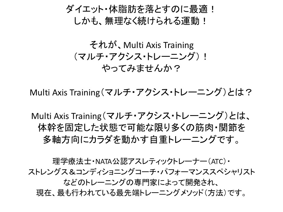 それが、Multi Axis Training(マルチ・アクシス・トレーニング)!やってみませんか?