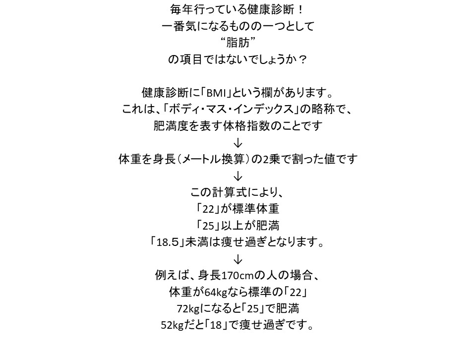 健康診断に「BMI」という欄があります。これは、「ボディ・マス・インデックス」の略称で、肥満度を表す体格指数のことです