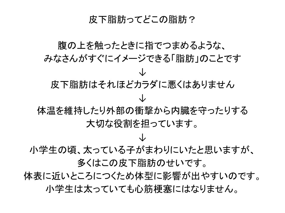 小学生の頃、太っている子がまわりにいたと思いますが、多くはこの皮下脂肪のせいです。体表に近いところにつくため体型に影響が出やすいのです。小学生は太っていても心筋梗塞にはなりません。