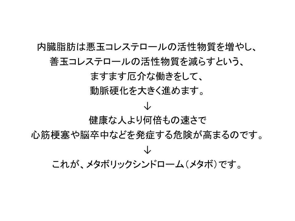 内臓脂肪は悪玉コレステロールの活性物質を増やし、善玉コレステロールの活性物質を減らすという、ますます厄介な働きをして、動脈硬化を大きく進めます。