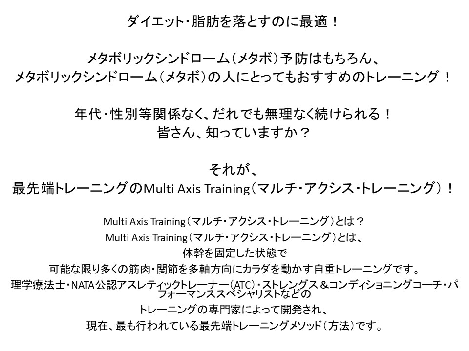 Multi Axis Training(マルチ・アクシス・トレーニング)とは、体幹を固定した状態で可能な限り多くの筋肉・関節を多軸方向にカラダを動かす自重トレーニングです。理学療法士・NATA公認アスレティックトレーナー(ATC)・ストレングス&コンディショニングコーチ・パフォーマンススペシャリストなどのトレーニングの専門家によって開発され、現在、最も行われている最先端トレーニングメソッド(方法)です。
