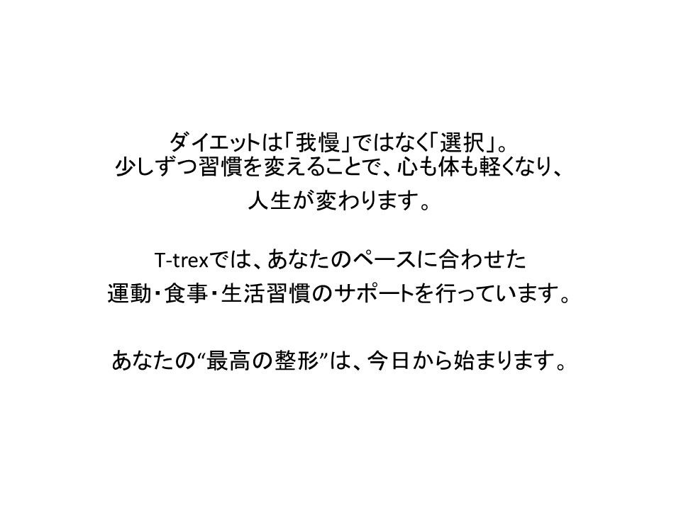 T-trexでは、あなたのペースに合わせた運動・食事・生活習慣のサポートを行っています。