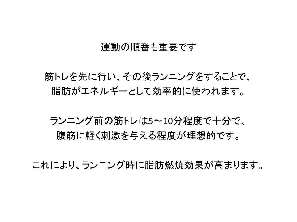 筋トレを先に行い、その後ランニングをすることで、脂肪がエネルギーとして効率的に使われます。ランニング前の筋トレは5〜10分程度で十分で、腹筋に軽く刺激を与える程度が理想的です。これにより、ランニング時に脂肪燃焼効果が高まります。