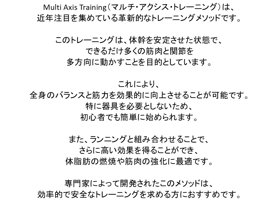 Multi Axis Training(マルチ・アクシス・トレーニング)は、近年注目を集めている革新的なトレーニングメソッドです。このトレーニングは、体幹を安定させた状態で、できるだけ多くの筋肉と関節を多方向に動かすことを目的としています。これにより、全身のバランスと筋力を効果的に向上させることが可能です。特に器具を必要としないため、初心者でも簡単に始められます。また、ランニングと組み合わせることで、さらに高い効果を得ることができ、体脂肪の燃焼や筋肉の強化に最適です。専門家によって開発されたこのメソッドは、効率的で安全なトレーニングを求める方におすすめです。