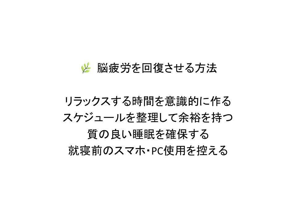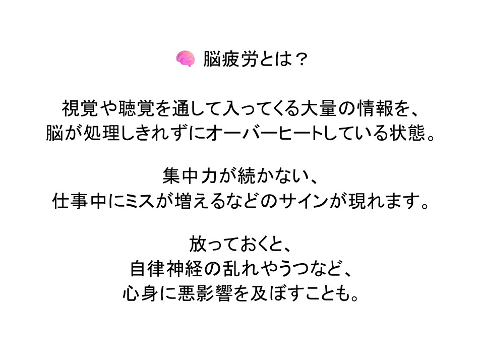今回は、休んでも疲れがとれない、集中力が続かない?気づかないうちに進む「脳疲労(脳の疲れ過ぎ)」にご用心!です。