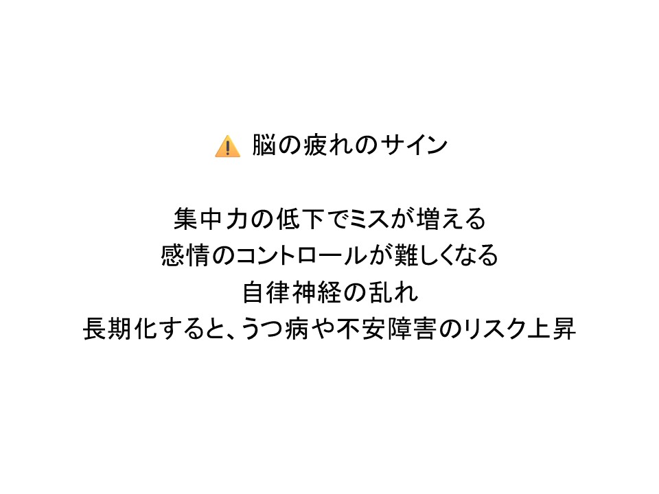 集中力が続かない、仕事中にミスが増えるなどのサインが現れます。