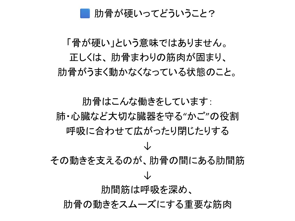 「骨が硬い」という意味ではありません。 正しくは、 肋骨まわりの筋肉が固まり、肋骨がうまく動かなくなっている状態のこと。