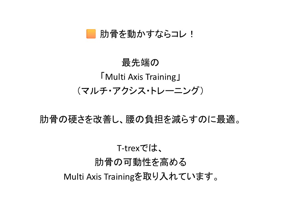 T-trexでは、 肋骨の可動性を高める Multi Axis Trainingを取り入れています。